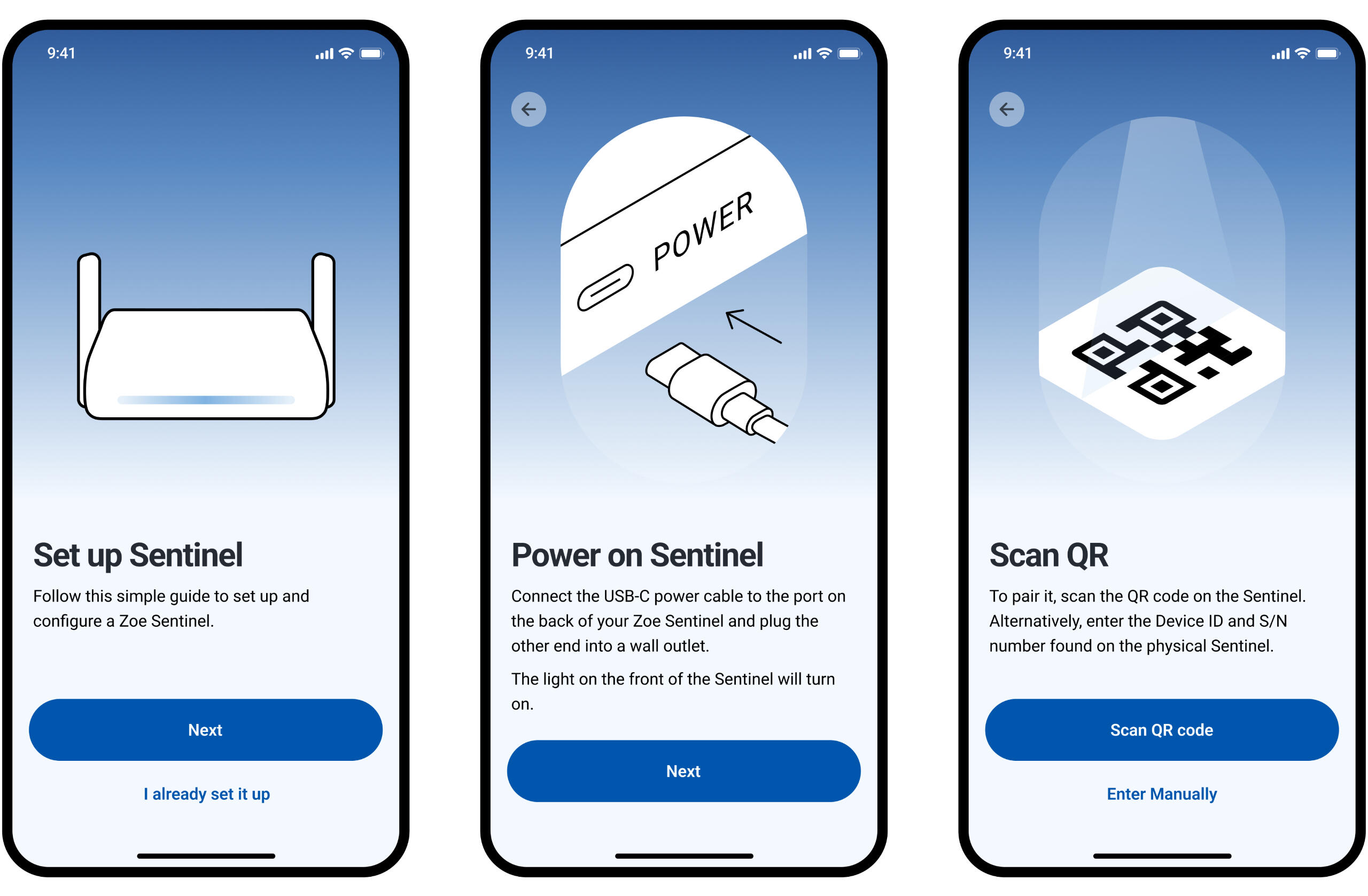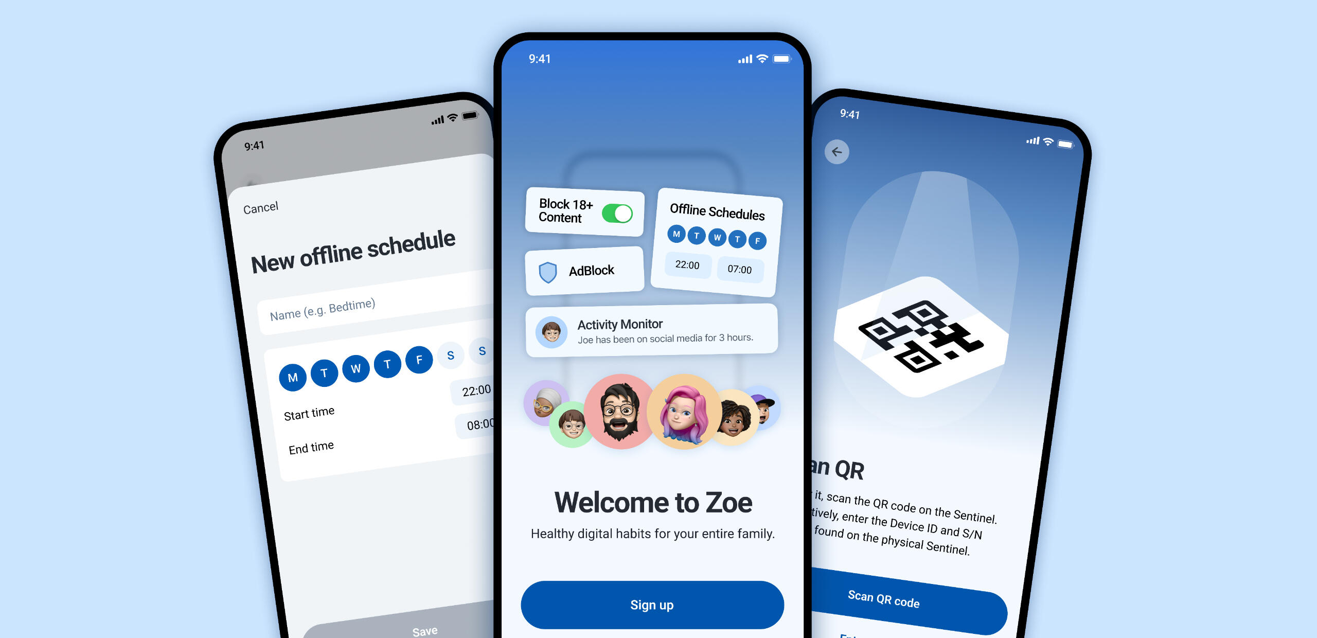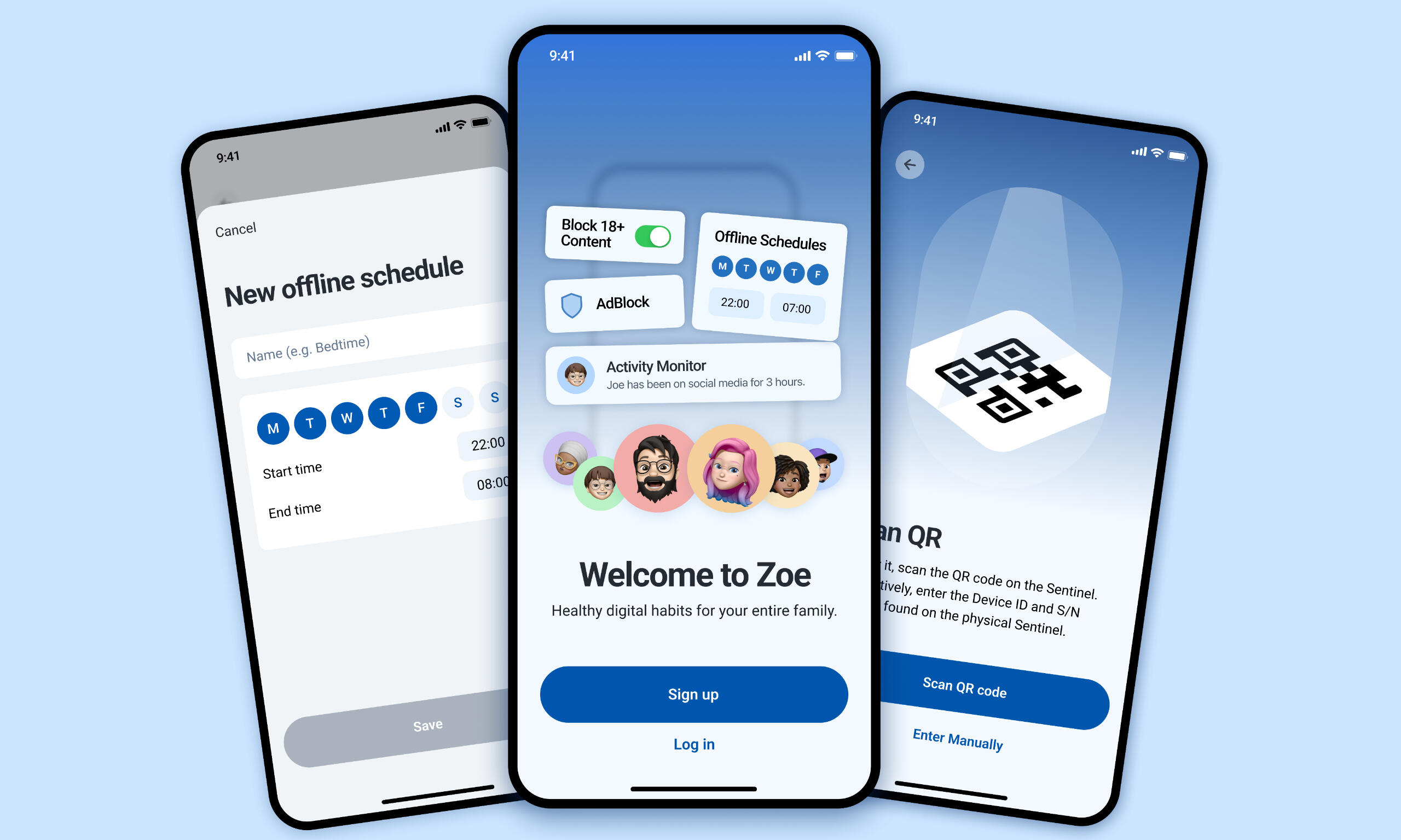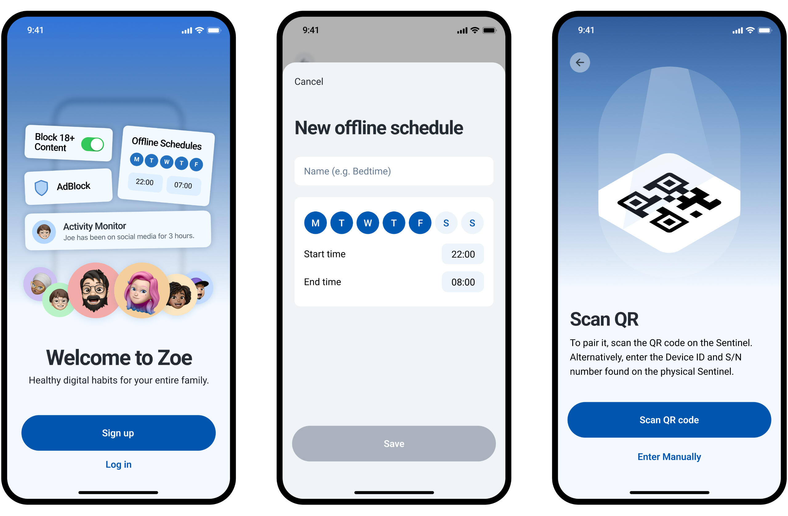 The Zoe app pairs with the Zoe sentinel, a physical device that is connected to the household's Wi-Fi router. This device acts as a gateway to manage, monitor, and educate family members about their internet usage.