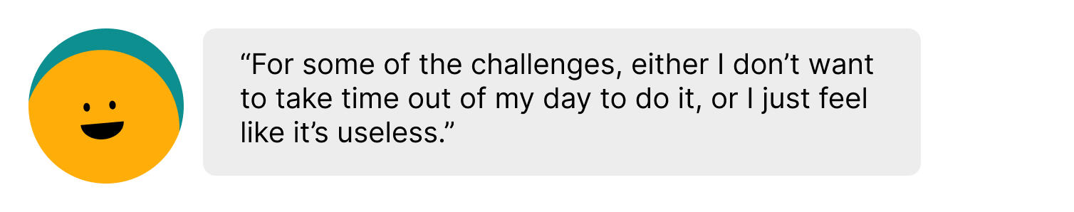 From the interviews, I noticed a low perceived usefulness about the individual modules, and a large perceived gap in the how the solution is supposed to solve their problem. For example, one of the interviewees said: βI think that the intent of joining the app was kind of lost here. I think there was some gapβ, and another said: βFor some of the challenges, either I donβt want to take time out of my day to do it, or I just feel like itβs useless.β