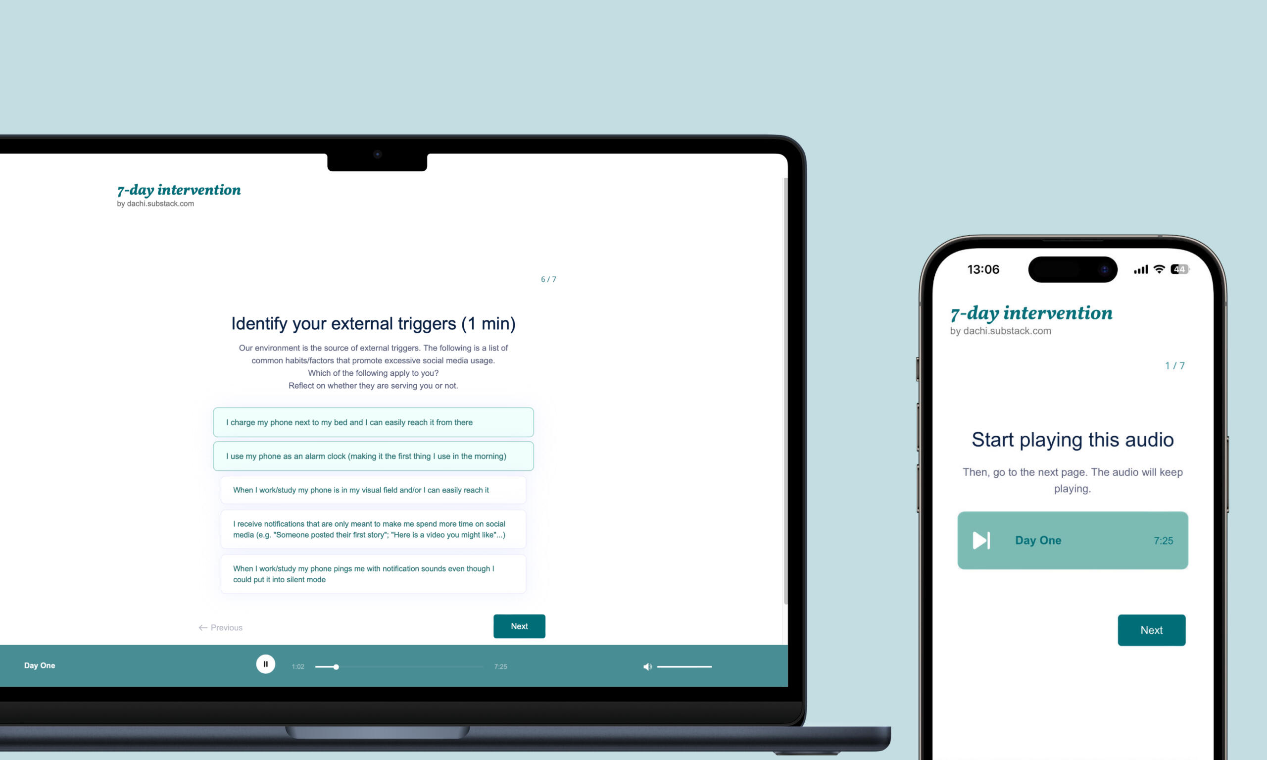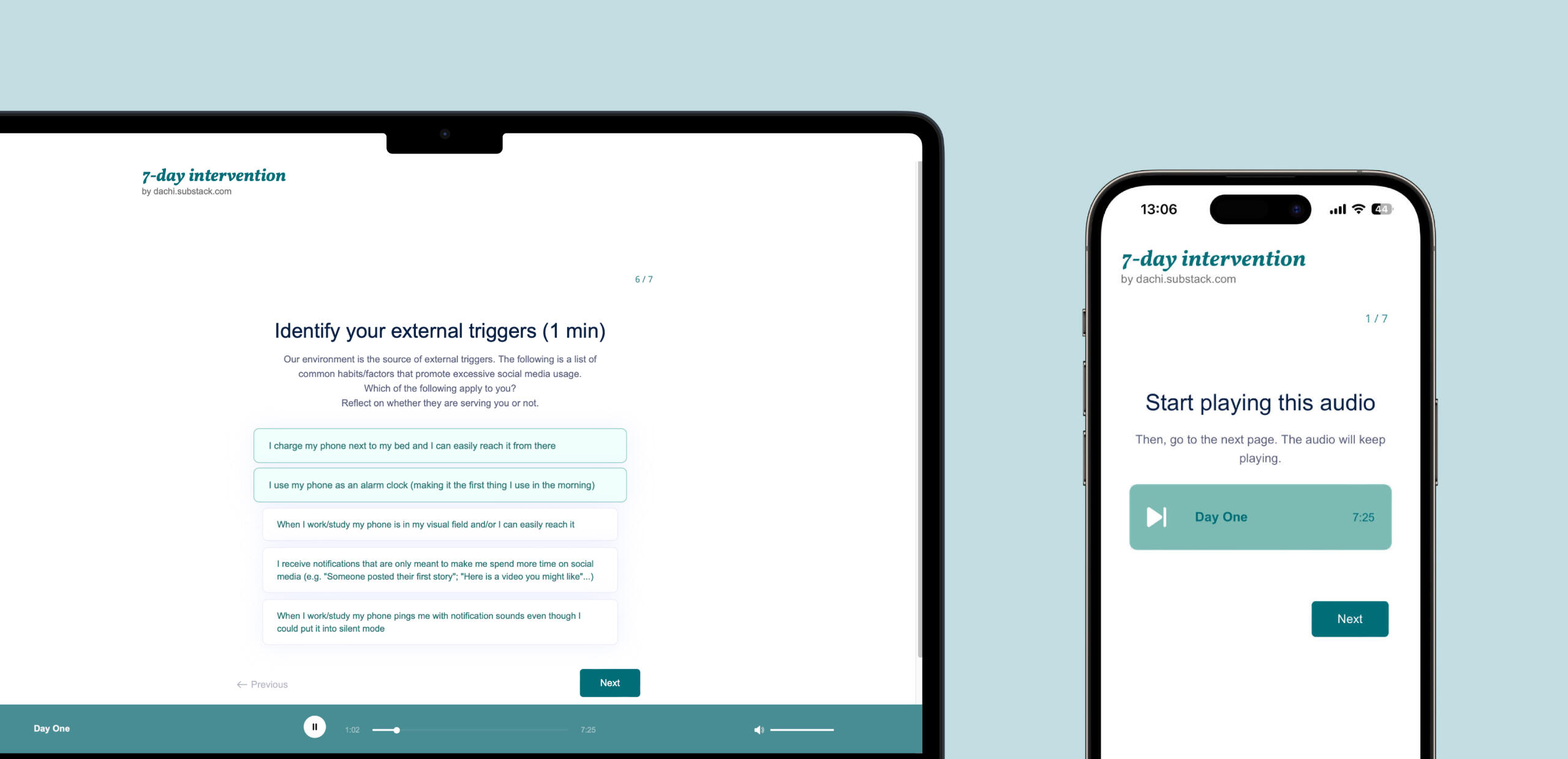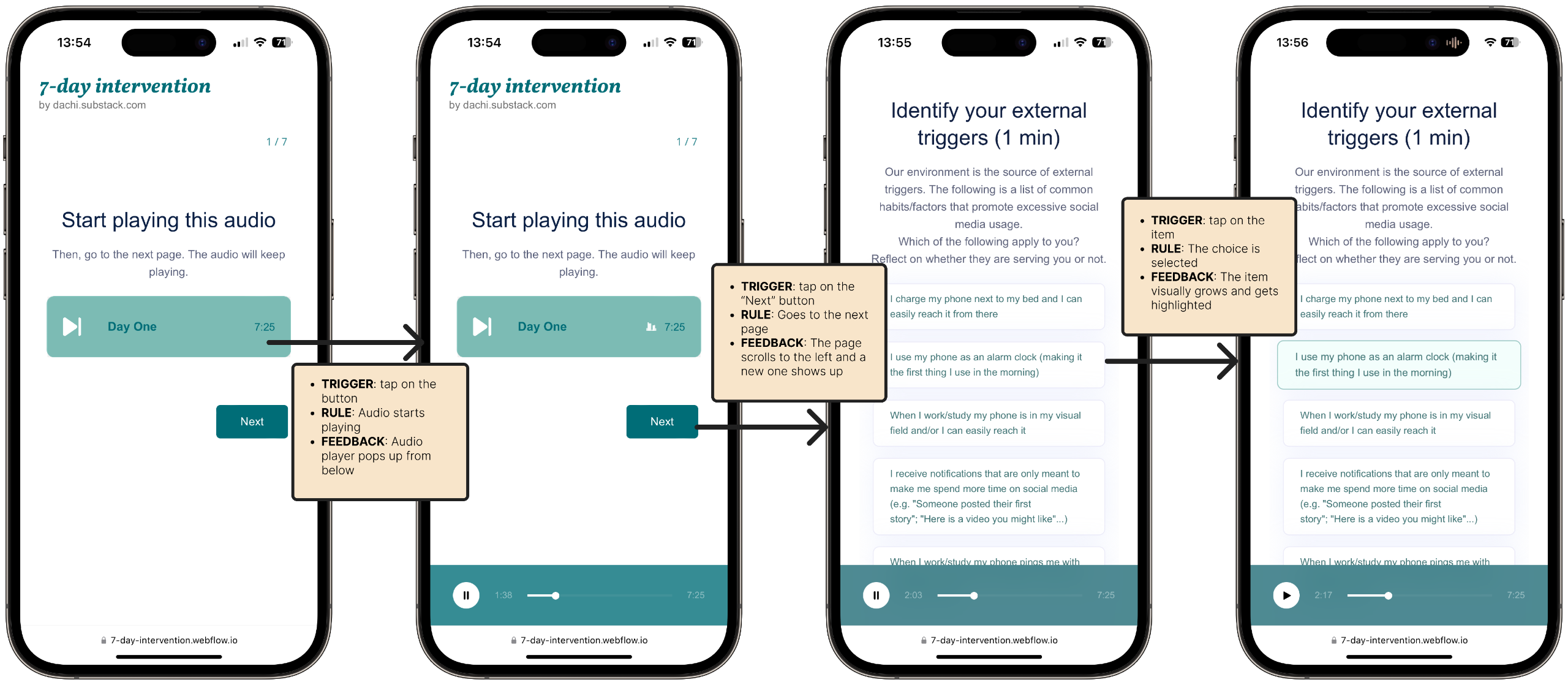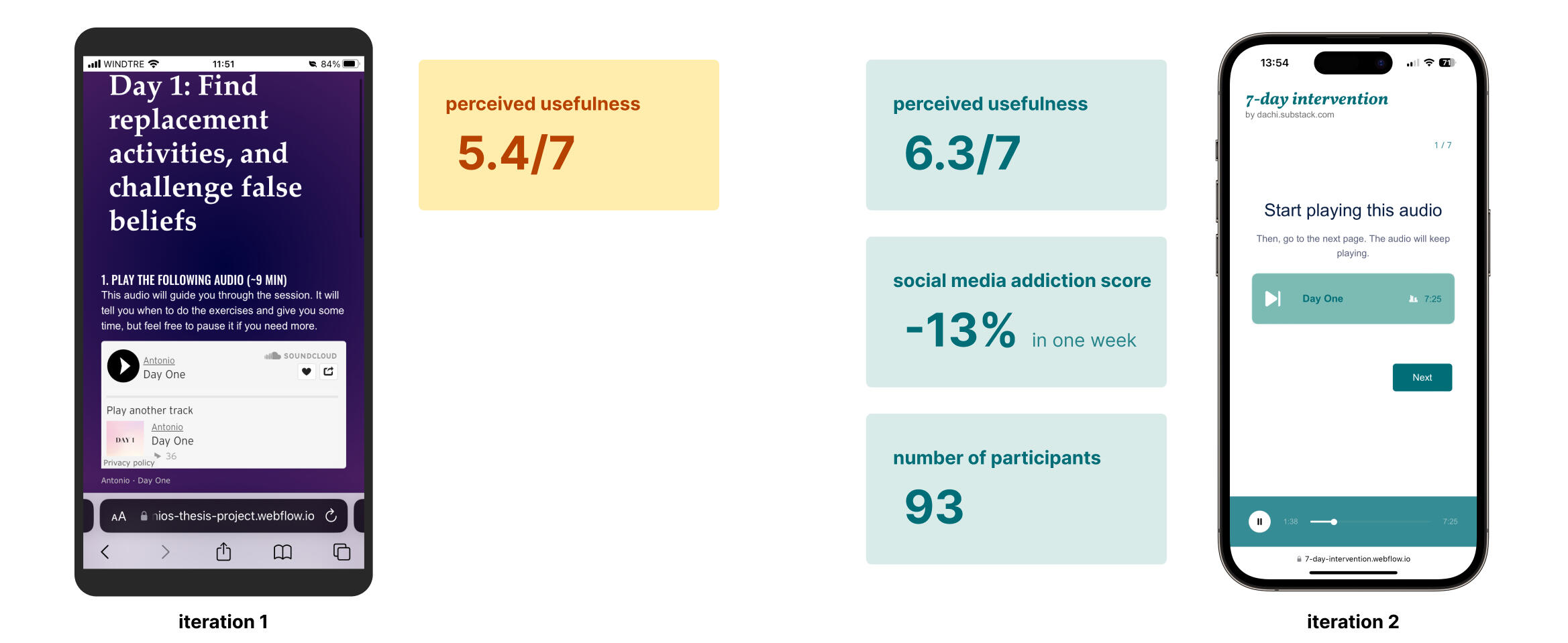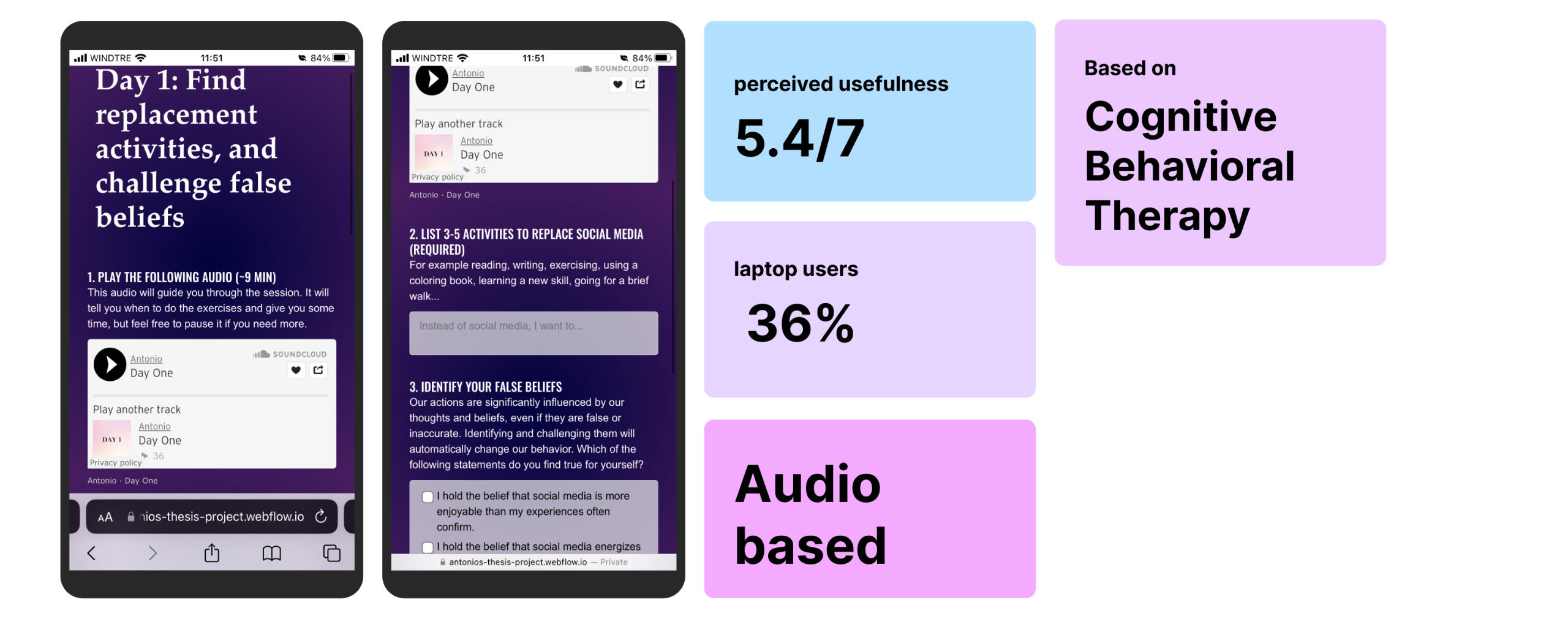 The study showed a 13% decrease in social media addiction scores, and a 17% increase in perceived usefulness from the previous iteration.Therefore the product is an effective solution to the final problem statement: it is scalable, does not ask for complete abstinence, but retrains usersβ behaviors based on a researched model of behavioral addiction. The perceived usefulness received a score of 6.3 out of 7, and the product showed a significant decrease in social media addiction measures based on the BSMAS.Compared to the current commercial CBT-based solutions, it provides an audio-first interaction, during which exercises are done and the script is being read at the same time. It is also the only psycho-educational in the market with a pure focus on social media addiction.