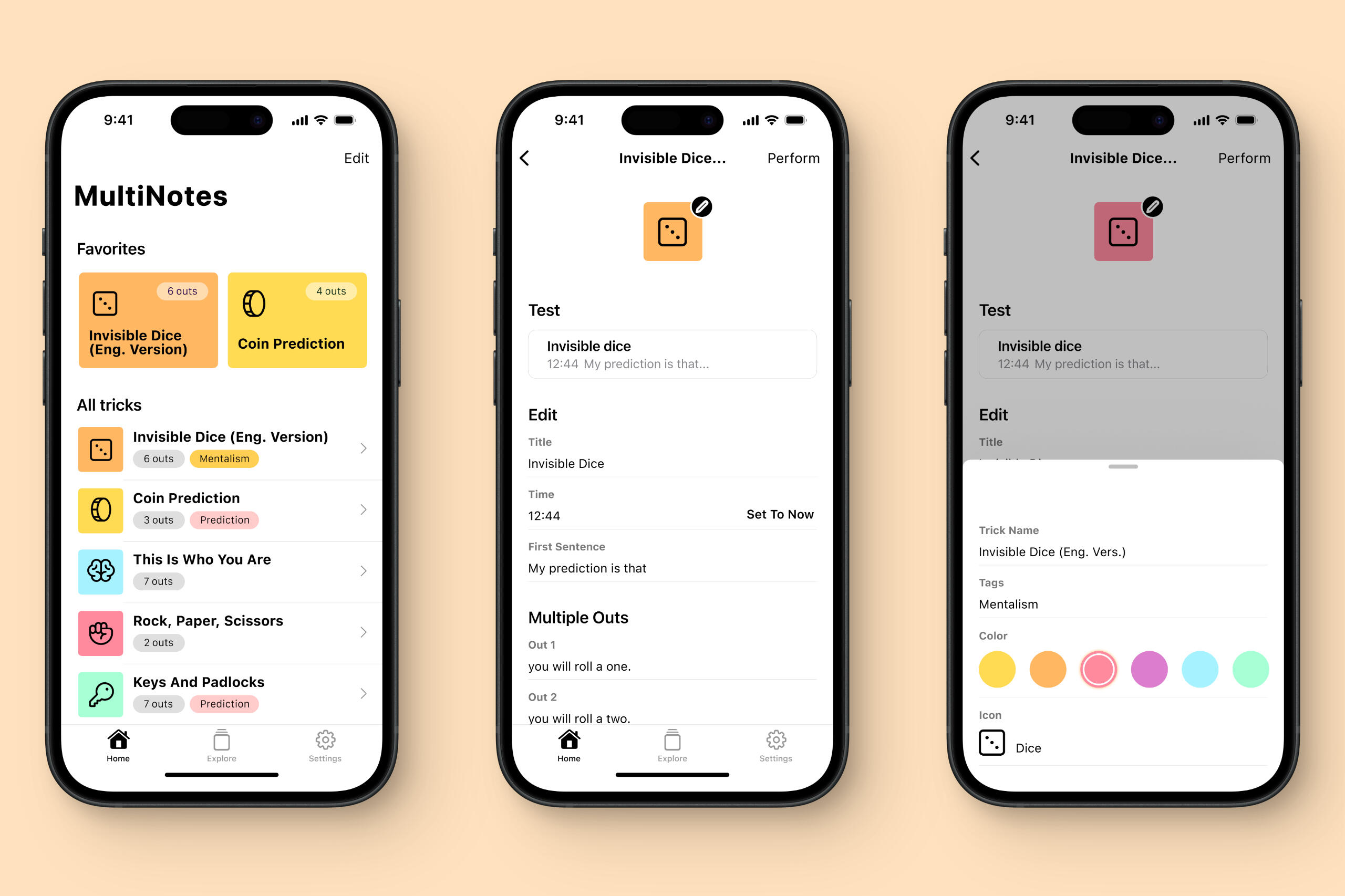 MultiNotes allows magicians to create custom magic tricks using their phone. Once they press "Perform", the app turns into a special version of the Notes app, that allows them to perform those tricks.For example, the magician might write down his prediction about the outcome of a dice role. The dice is rolled. It shows a six. The magician opens his note and shows that he predicted the outcome correctly.Out of respect of the magic community, the secret method is not shared on this page.
