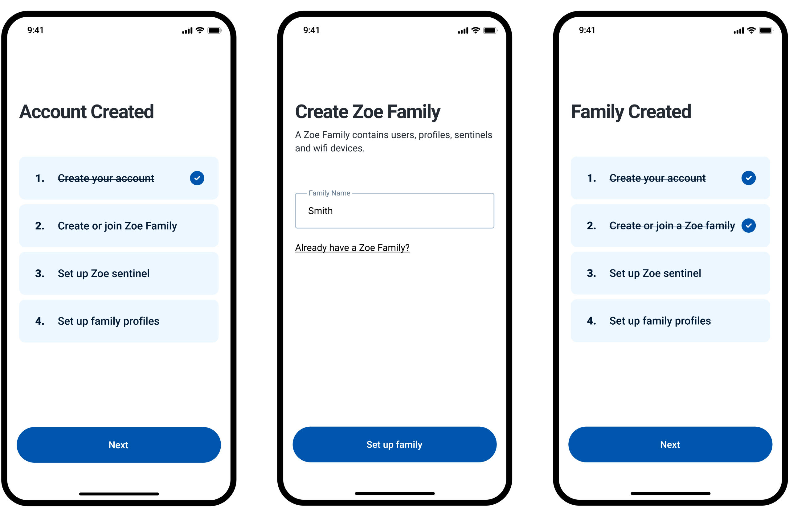 I changed the flow of the onboarding to require setting up at least a family member's profile.Β This ensured that Zoe was functional immediately after set-up.Then, together with the technical team, we came up with a new way of assigning an owner to each device. For each child, the parent's phone displayed a QR code. The child scanned this QR code with their phone, automatically pairing the device. For devices without cameras, users could complete the pairing process via the Zoe website.Additionally, I incorporated best practices in onboarding design to reduce cognitive load, minimize friction, and modernize the visual design. This approach ensured a smoother and more intuitive user experience.